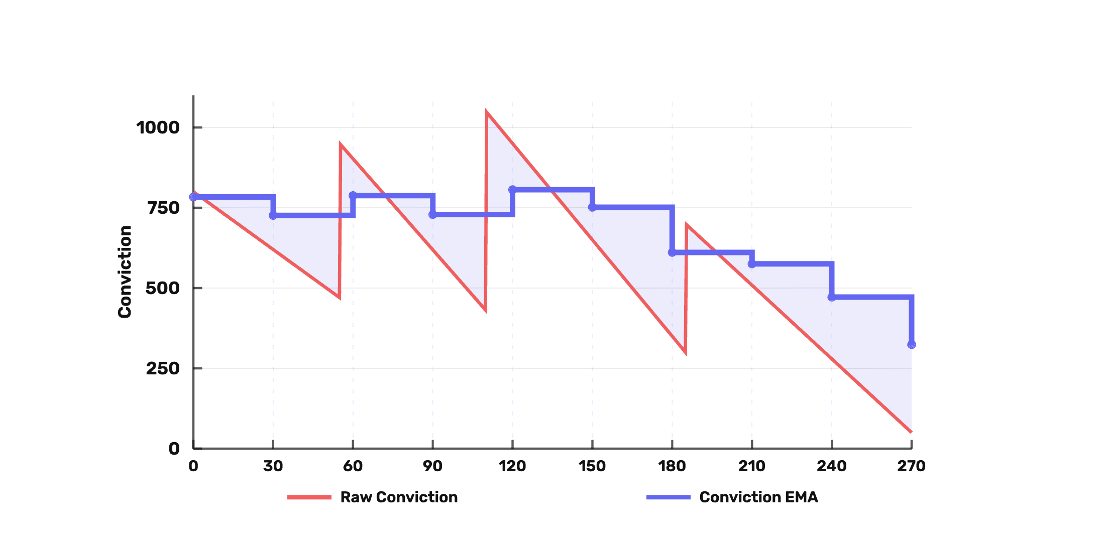Conviction scores change continuously as locks approach expiry. To prevent sudden ownership changes, the protocol uses a Conviction EMA (Exponential Moving Average), which is a smoothed version of each staker's conviction over time.