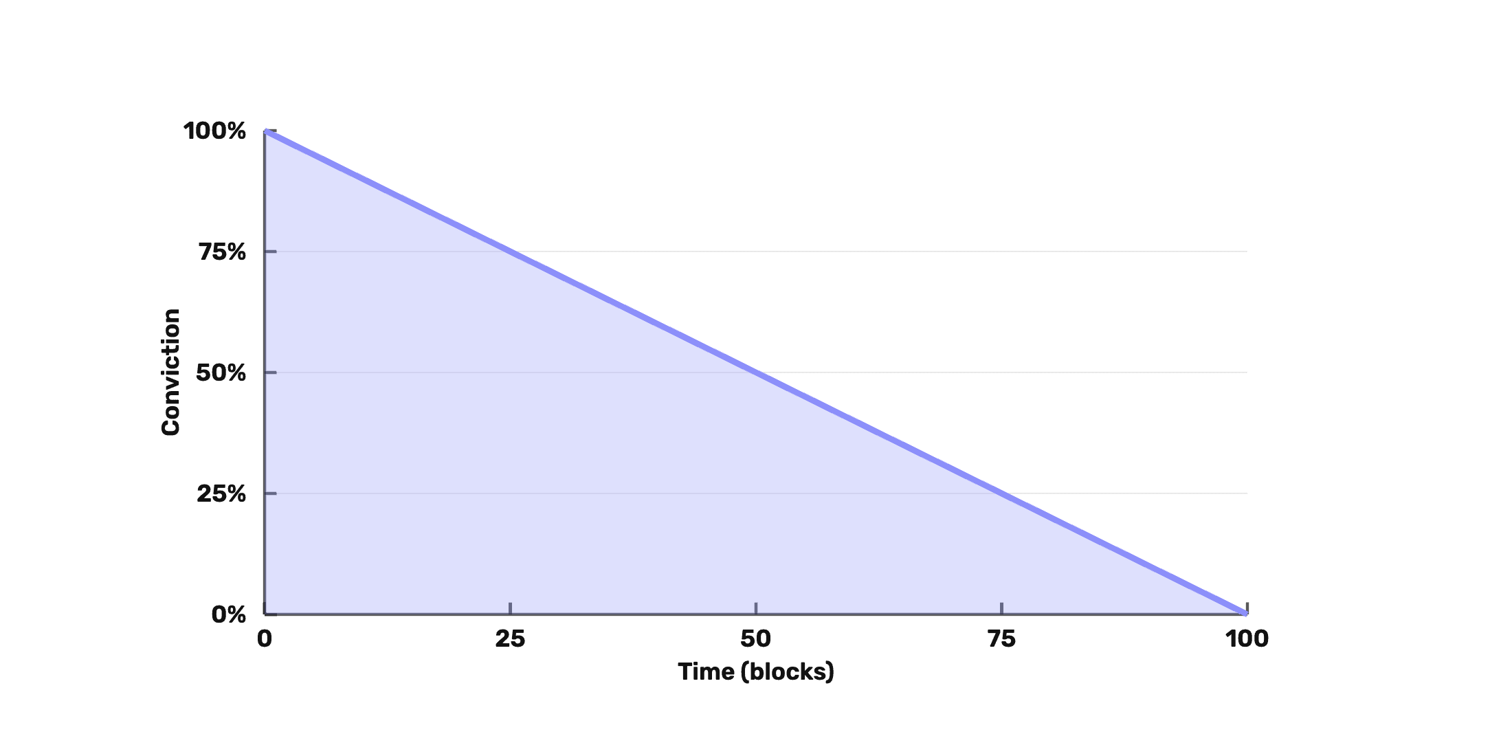 Conviction is a score that reflects how much stake is locked and for how long it still has to run. It starts at 100% of the locked ALPHA amount at the moment the lock is created, then decreases linearly down to 0 by the time the lock expires.